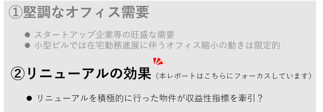 以上より、小型ビルでも適切なリニューアルを施すことで物件の差異化に繋がり、中型ビル並みの収益を上げることは可能と言えるでしょう。型ビルと競合する可能性がある中型ビルにとっては、競争力を持った小型ビルが脅威になり得るとも言えます。