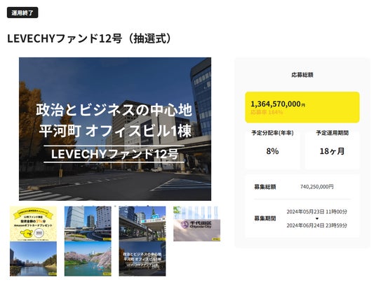 1万円から始める賢い資産運用「LEVECHY(レベチー)」を展開する株式会社LEVECHY(所在地:東京都港区赤坂、代表取締役:高 将司)は、2025年4月30日(水)に「LEVECHY」の第12号ファンドである「LEVECHYファンド12号」の償還及び配当が完了したことをお知らせいたします。