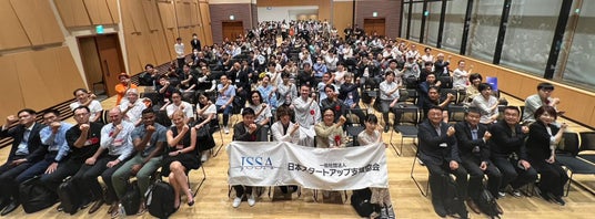全参加者による右腕で右肩上がりの株価チャートを表現したJSSAポーズによる集合写真