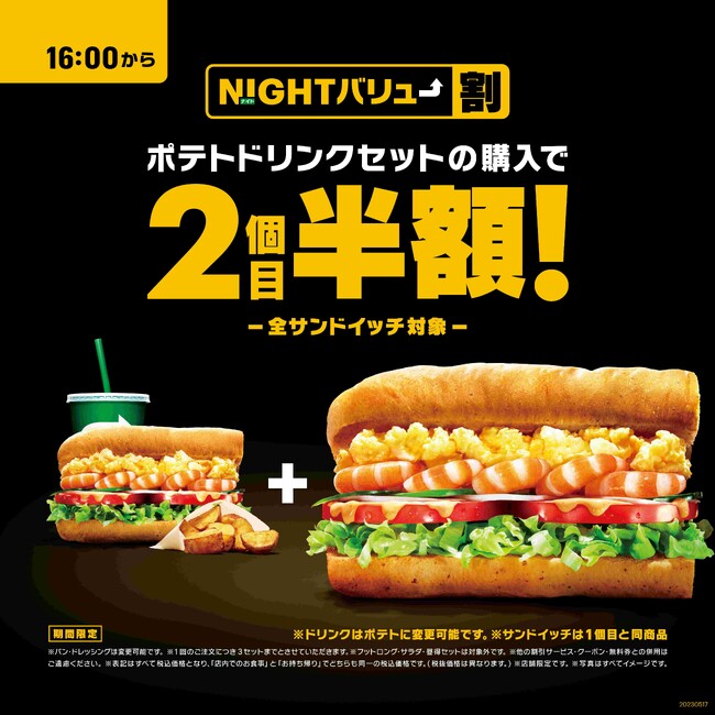 サブウェイは2022年春から、夜限定のセットメニュー「NIGHTバリュー」をご提供しています。「NIGHTバリュー」は16時以降に販売されるセットメニューで、サンドイッチ・ピザサブのポテトドリンクセットにサンドイッチ価格の半額をプラスするだけで、同じサンドイッチがもう1個ついてくる、大変お得なセットメニューです。