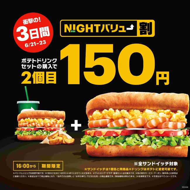 もっとたくさんの皆様にこの「NIGHTバリュー」をご利用いただきたく、6月21日(水)から3日間限定で、1周年記念キャンペーンを実施します。この期間限定で、サンドイッチのポテトドリンクセット+150円で同じサンドイッチをもう1個お求めいただけます。このセットは、とろ~りモッツァレラが人気のピザサブも選べます。