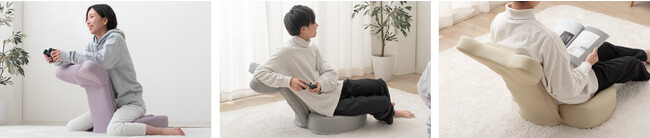 (↑写真左:背もたれ側を向いた自然と背筋が伸びる体勢。/写真中央:豊富な調節機能で楽な体勢が取れます。写真右:通常の座椅子のようにもお座りいただけます。)