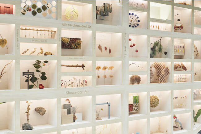 ウィンドウには、銀座の街を模した全72区画の棚を設置し、フィールドワークによって採取した植物や土壌、さらには人の営みにまつわるものを素材にした作品を2021年4月~2022年4月の期間を通して展示しました。銀座は資生堂の創業の地であり、同じ地域に本社を構える当社と共創し、当プロジェクトを通して、地域とつながるコミュニケーションの活性化を目指しました。