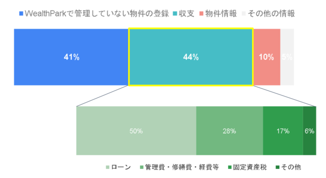 不動産経営において、物件に関わる収支は、家賃収入、修繕費、ローン、固定資産税など様々です。これらは、管理会社から提供を受ける情報と、オーナー自身が管理する情報があります。従来「WealthParkビジネス」のアプリでは、管理会社から提供を受ける収支情報(家賃収入、管理会社が代行する修繕費用 など)のみを扱っていました。これに対し、オーナーからは、自身が管理する収支情報(ローン、固定資産税、オーナー自身が手配する修繕費用 など)についてもアプリに集約したいという声が多く寄せられていました。