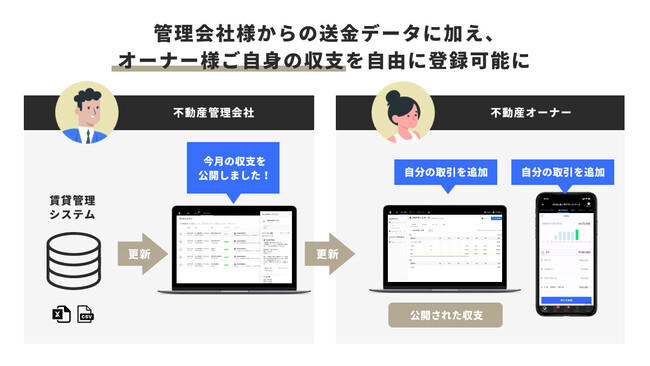 「管理会社から提供を受ける収支情報以外でも、不動産収支に関する情報の登録を自身で行いたい」という声に応えるべく、第一弾としてオーナーが自ら収支情報を自由に登録できる「オーナー入力機能」をリリース致しました。