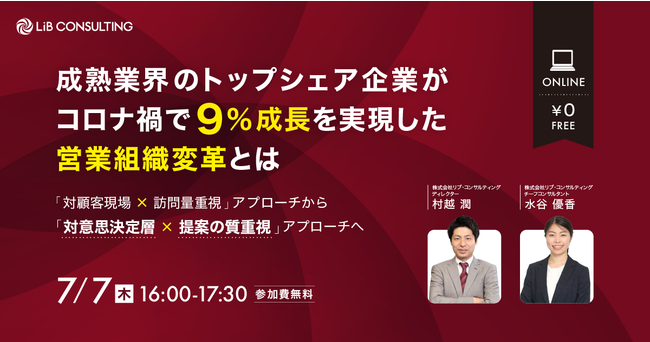 クライアントの売上向上を強みとする株式会社リブ・コンサルティング(本社:東京都千代田区、代表取締役:関厳)は、営業組織の変革を成功させるための、綿密な全体設計~実行方法について、事例をもとに紹介する「営業組織変革」セミナーを2022年7月7日(木)にオンライン開催します。