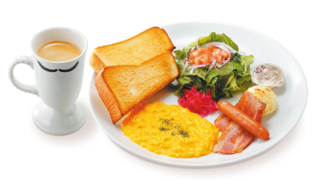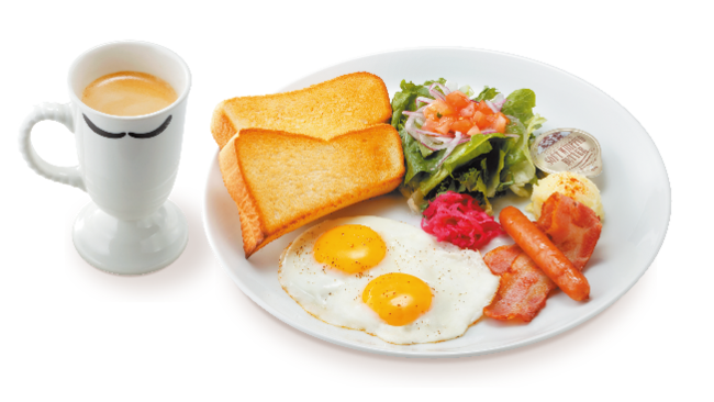 すてきな1日の始まりとして、モーニングから満足していただきたいという思いから、トースト、サラダ、マッシュポテト、ベーコン、ソーセージに加えて、卵料理が食べられる新メニューです。卵料理は、目玉焼きかスクランブルエッグを選べ、みそ汁またはドリンクもついたセットになっています。
