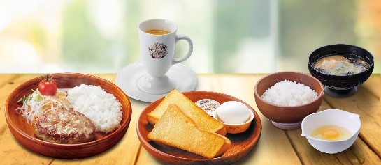朝食にぴったりなサイズの100gのハンバーグが入ったディッシュとみそ汁がセットになった「ミニマムディッシュセット」やびっくりドンキーのオリジナルソースで食べる「卵かけご飯」は大人からお子様まで幅広い人気を博しています。『朝はパン派』の人にも喜んでいただけるようトースト、ゆでたまご、ドリンクをセットにした「トーストセット」も提供しており、バリエーションもプレーンの他にチーズトーストやポテサラトーストなど幅広くご用意しております。また、モーニングでは、コーヒー(ホット・アイス)をご注文の場合、AM11:00までおかわり自由となっており、くつろいでお過ごしいただくことができます。