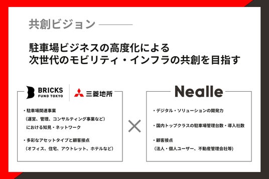 ニーリーは、三菱地所株式会社が運営し、成長産業の共創を目指すスタートアップ投資ファンド“BRICKS FUND TOKYO”(共同運営者:株式会社プライムパートナーズ)から資金調達を実施いたしました。本資金調達を契機とした三菱地所株式会社との事業連携により、短期的には、三菱地所グループが管理する月極駐車場・住宅付随の駐車場活用や「Park Direct for Business」との取り組みの実施、中・長期的にはモビリティデータの活用などを通じ、スマートシティの実現に向けた駐車場ビジネスのデジタル化・高度化を推進し、次世代のモビリティ・インフラの共創を目指してまいります。