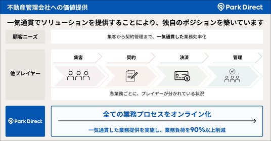 これまでの駐車場管理は集客・契約・決済・管理の各業務において、それぞれのオンライン化を担う企業やサービスが分かれている状況で、一方で不動産管理会社にとっては、駐車場管理に関わる業務は煩雑であり、全てをまとめて効率化したいというニーズがありました。