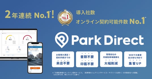 Park Directは月極駐車場の募集、申込、契約、支払、賃料保証、更新/解約といった一連の業務を一気通貫してオンライン上で完結できるシステムとサービスを構築してまいりました。その結果、不動産管理会社様、オーナー様、駐車場ユーザーの皆さまにご評価いただき、この度「導入社数」「オンライン契約可能件数」で業界No.1となりました。