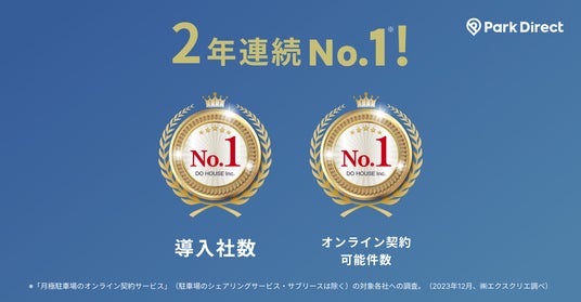 モビリティSaaSのリーディングカンパニーである株式会社ニーリー(代表取締役:佐藤 養太)が運営する「Park Direct(パークダイレクト)」は、株式会社エクスクリエ(代表取締役社長:高栖 祐介)が2023年12月に実施した月極駐車場オンライン契約サービスの「導入社数」「オンライン契約可能件数」の項目において2年連続でNo.1(※1)を獲得したことをお知らせいたします。