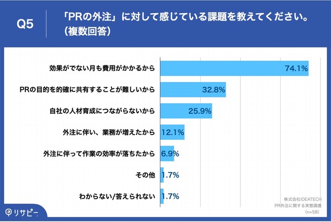 Q4で「非常にそう感じる」「ややそう感じる」と回答した方に、「Q5.「PRの外注」に対して感じている課題を教えてください。(複数回答)」(n=58)と質問したところ、「効果がでない月も費用がかかるから」が74.1%、「PRの目的を的確に共有することが難しいから」が32.8%、「自社の人材育成につながらないから」が25.9%という回答となりました。