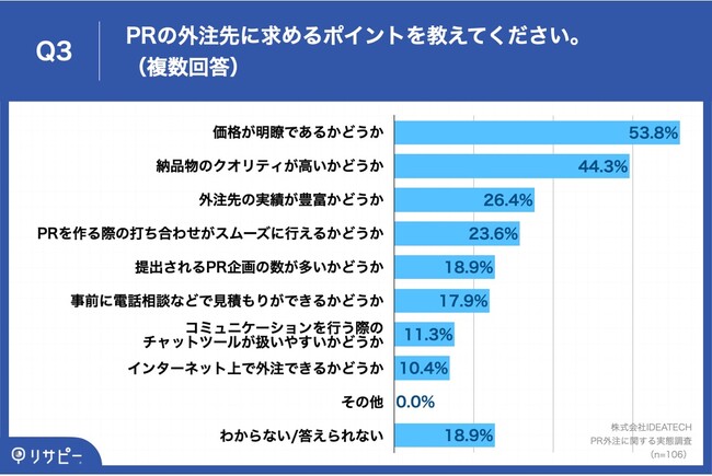 「Q3.PRの外注先に求めるポイントを教えてください。(複数回答)」(n=106)と質問したところ、「価格が明瞭であるかどうか」が53.8%、「納品物のクオリティが高いかどうか」が44.3%、「外注先の実績が豊富かどうか」が26.4%という回答となりました。