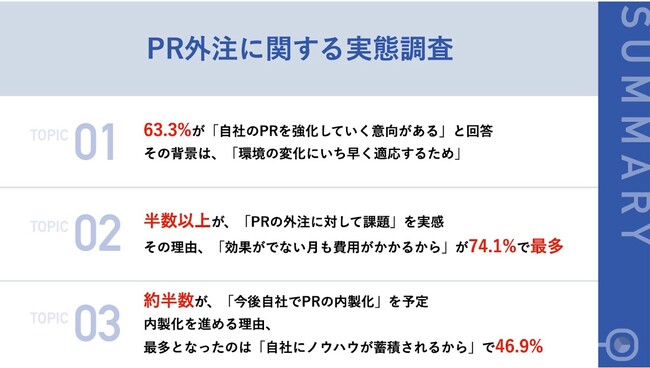 今回の調査では、PR・広報領域を外注している企業が、今後は内製化に切り替える意向が強く、これからさらにPRを強化してこうと考えていることが分かりました。PRの価値を理解している経営者にとって、外注への依頼だけでは思うような成果に結びつかないなどの課題も多く、商品やサービスについて熟知している社員でノウハウを積み上げることが、将来的なブランディングに繋がると考えていると言えるのではないでしょうか。