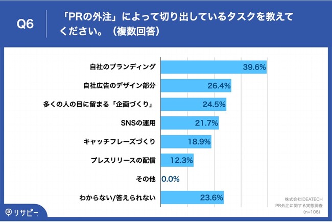 「Q6.「PRの外注」によって切り出しているタスクを教えてください。(複数回答)」(n=106)と質問したところ、「自社のブランディング」が39.6%、「自社広告のデザイン部分」が26.4%、「多くの人の目に留まる「企画づくり」」が24.5%という回答となりました。