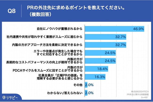 Q7で「考えている」と回答した方に、「Q8.PRを内製化していこうと考えている理由を教えてください。(複数回答)」(n=49)と質問したところ、「自社にノウハウが蓄積されるから」が46.9%、「社内連携や共有が取れやすく業務がスムーズに進むから」が32.7%、「内製の方がアプローチ方法を柔軟に決定できるから」が32.7%という回答となりました。