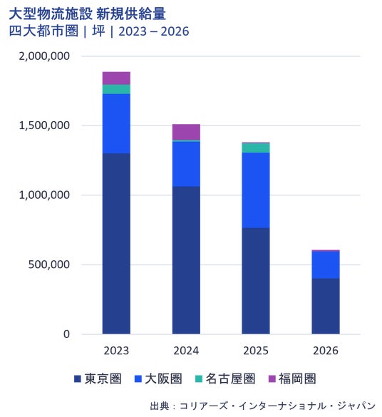 大手総合不動産コンサルティングサービス・投資運用会社であるコリアーズ・インターナショナル・ジャパン株式会社(代表:小笠原 行洋、本社:東京都千代田区、NASDAQおよびTSX:CIGI、以下コリアーズ・ジャパン)は、本日、「大型物流施設 2024~2026年の新規供給の見通し|四大都市圏」を発表しました。当レポートは、コリアーズ・ジャパンが、東京圏、大阪圏、名古屋圏、福岡圏の物流施設の新規供給量の今後の見通しについて、独自に収集したデータに基づいて分析したものです。