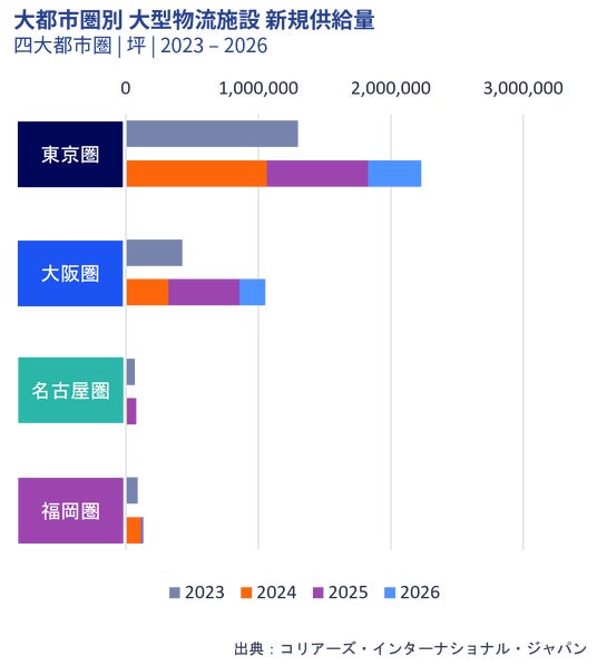 大型物流施設 新規供給量 四大都市圏 | 坪 | 2023 - 2026