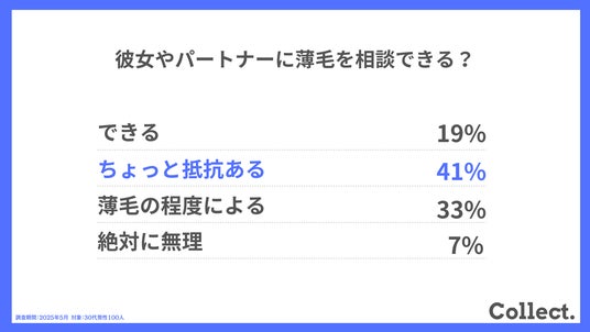 彼女・パートナーに薄毛を相談できるかは、「ちょっと抵抗がある(41%)」と「程度による(33%)」を合わせて約7割の男性が抵抗を感じていて、積極的に話すハードルの高さがうかがえます。