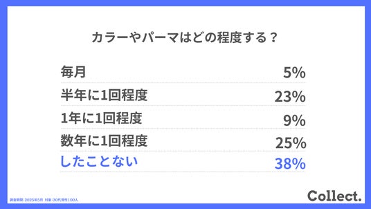 髪へのダメージが懸念されるカラーやパーマですが、「したことがない(38%)」がもっとも多く、する男性でも数年に1回程度と、そもそもしない・しても積極的ではない傾向が見られます。