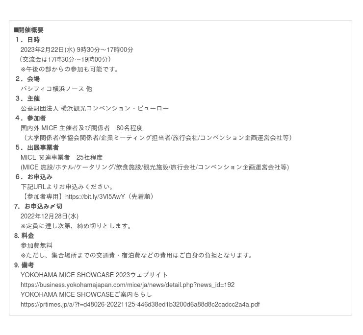 昨今の水際対策の大幅な緩和により国際的な MICE 再開が見込まれるとともに、海外からの来訪者数回復の勢いが一段と加速すると期待される今、会場探しはもちろん、まだ知られていない「横浜ならではの体験」や市内事業者との最新情報交換の場としてご参加ください。