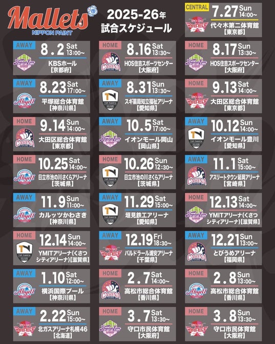 ノジマTリーグ2025-2026シーズンのマレッツの試合日程は以下の通りです。