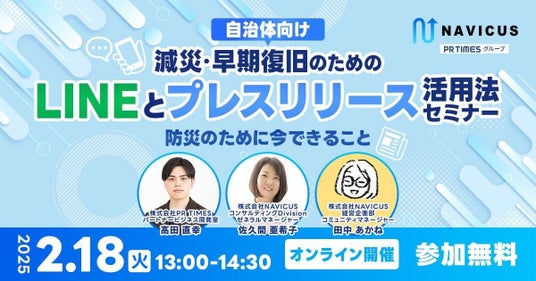 SNSを通じて企業様や地方自治体様のコミュニケーション支援サービスを提供する株式会社NAVICUS(本社:東京都千代田区、代表取締役:武内 一矢、以下:NAVICUS)と、株式会社PR TIMES(本社:東京都港区、代表取締役:山口拓己、東証プライム:3922、以下:PR TIMES)は、2025年2月18日(火)に無料ウェビナー「【自治体向け】減災・早期復旧のためのLINEとプレスリリース活用法セミナー~防災のために今できること~」を開催いたします。