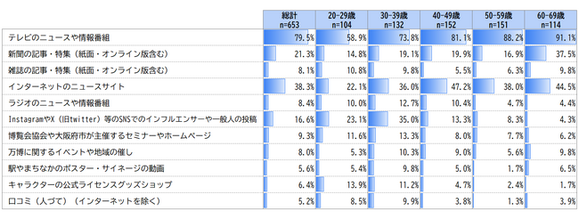 関心や来場意向のある層に、関心や来場意向につながった情報源(※4)を聞いた。各年代とも「テレビのニュースや情報番組」が最も多い。60-69歳では「テレビのニュースや情報番組」が91.1%と最も多く、次いで、「インターネットのニュースサイト」が44.5%や「新聞の記事・特集」が37.5%と多い。