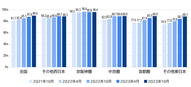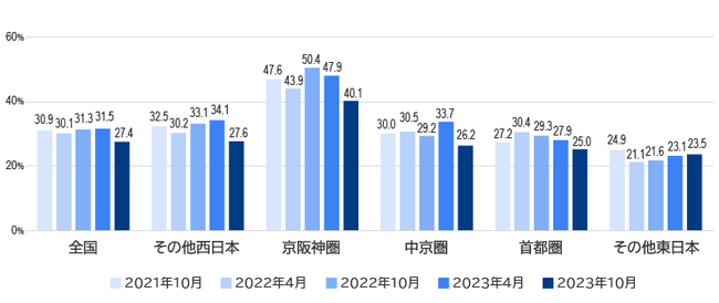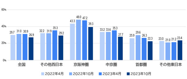 地域別にみると、これまで最も高かった京阪神圏で前回調査の47.2%から8.0pt低下して、39.3%となった。