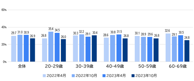 年代別では、これまで最も高かった20-29歳で前回調査の34.5%から8.6pt低下して、26.0%となった。30-39歳は横ばい。