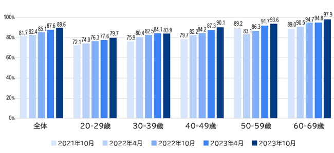年代別でみると、60-69歳や40-49歳代で上昇している。また若年層ほど認知度が低く20-29歳は79.7%、次いで30-39歳が83.9%であった。