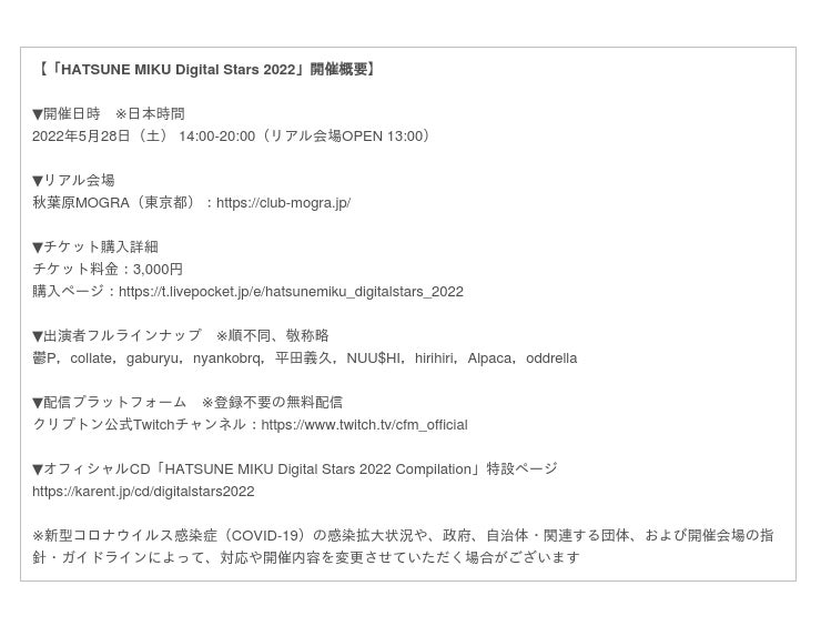 クリプトン・フューチャー・メディア株式会社(本社:北海道札幌市、代表取締役:伊藤博之)は、2022年5月28日(土)に開催する音楽イベント「HATSUNE MIKU Digital Stars 2022」について、出演者・チケット情報を含む開催概要を発表いたしました。オンラインのみでの開催が続いておりました本イベントですが、本年は満を持して東京(秋葉原MOGRA)にて開催。現地に直接赴くことが難しい方にもお楽しみいただけるよう、クリプトン公式Twitchチャンネルで無料ライブ配信も行います。