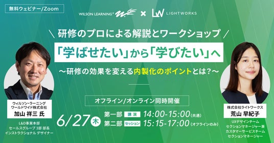 クラウド型学習管理システム(LMS)市場で最大の売上シェア*を持つ株式会社ライトワークス(本社:東京都千代田区、代表取締役:江口夏郎、以下「ライトワークス」)は、2024年6月27日(木)に、ウィルソン・ラーニング ワールドワイド株式会社(以下、「ウィルソン・ラーニング」)と共催ウェビナーを開催します。