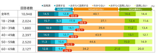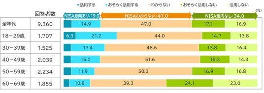 さらに、新NISA未利用者のうち、今後の利用意向について「わからない」と答えている層が、どの年代も4割前後いることがわかりました。