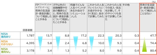 すると、【図表7】のとおり、新NISAの利用意向がある人の方が、「将来の生活設計・資金計画について検討したことはない」回答の割合が相対的に低くなっています。「NISA意向あり層」のうち過半数は、何かしらの将来設計・資金計画の検討をしていることがわかりました。