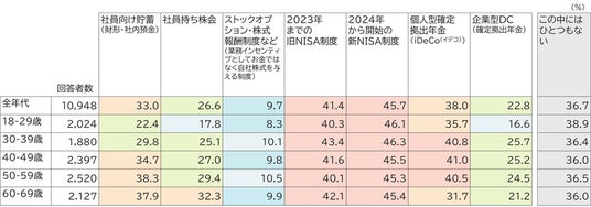 ※社員向け貯蓄(財形・社内預金),社員持ち株会,ストックオプション・株式報酬制度など(業務インセンティブとしてお金ではなく自社株式を与える制度),2023年までの旧NISA制度,2024年から開始の新NISA制度,個人型確定拠出年金(iDeCo(イデコ)),企業型DC(確定拠出年金),この中にはひとつもない, から複数回答