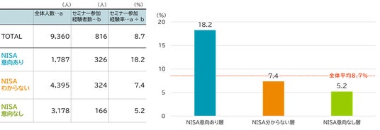 これらの3つのセグメントにおいて「利用意向がある」層と「それ以外」の層で、「学ぶ機会」の有無を確認してみます。「金融リテラシー向上のためのセミナー」の受講経験をそれぞれのセグメントで集計すると、「NISA意向あり」層はセミナー参加経験者率が18.2%となり、それ以外の層と比べて、顕著にセミナーの参加経験率が高い傾向となりました。