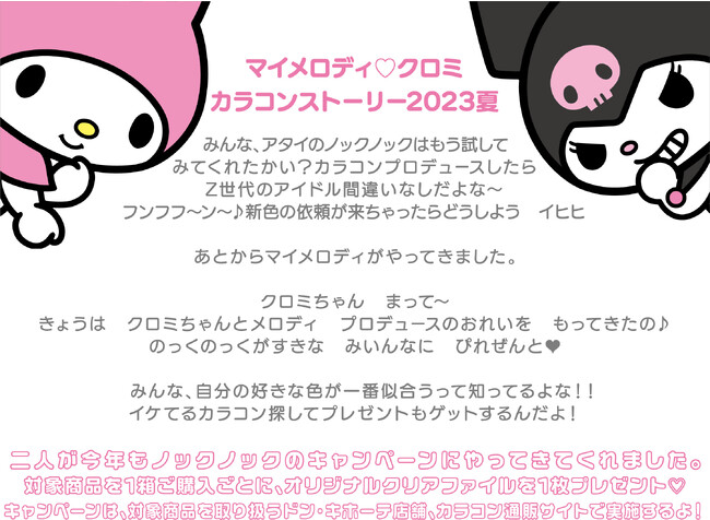 化粧雑貨、化粧品、服飾雑貨、及びキャラクター雑貨等の企画・製造・販売、コンタクトレンズの企画・販売を行う粧美堂株式会社(本社:東京都港区、代表取締役社長:寺田正秀、以下 粧美堂 )は、コンタクトレンズブランド Knock Knoc k(ノックノック)と株式会社サンリオのキャラクター「マイメロディ」「クロミ」と2023年夏のコラボキャンペーンを行います。