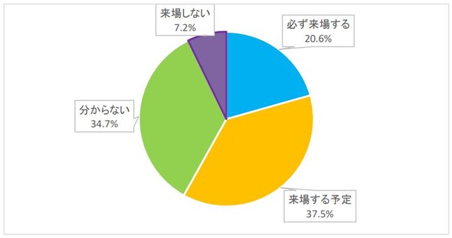 2025年に大阪・関西万博が地元大阪で開催されることを「知っている」97.7%となり、約2年先にも関わらず「必ず来場する」20.6%、「来場する予定」37.5%と6割弱が来場すると回答し、認知度や来場意欲ともに高くなりました。一方で、中小企業自身が出展を考えるかの質問には、「出展したい」6.2%と自社では無理なのではと控えめな結果でした。