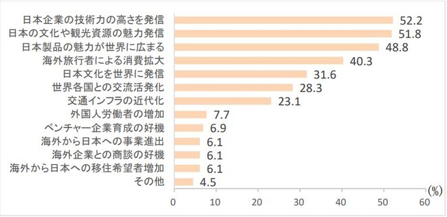 大阪・関西万博の効果として「日本企業の技術力の高さを発信」52.2%、「日本文化や観光資源の魅力発信」51.8%となり、日本企業の高い技術力で日本の文化や魅力を伝えることへの期待が高いといえます。海外に向けた日本の魅力を凝縮した万博となることで、様々な国々と良い関係づくりに繋がっていくことが望まれているようです。