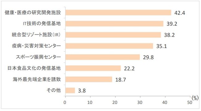 大阪・関西万博の会場である夢洲の跡地をどう活用するかについて、「健康・医療の研究関連施設」42.4%、「IT技術の発信基地」39.2%が上位に位置しました。万博のテーマである「いのち輝く未来社会のデザイン」に沿うように健康や医療に関する施設を望む声が高くなりました。