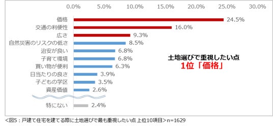 もし戸建て住宅を建てるなら、土地選びで最も重視したい点を尋ねたところ、「価格」(24.5%)という回答が最も多く、次いで2位が「交通の利便性」(16.0%)、3位「広さ」(9.3%)という結果になりました。(図5)