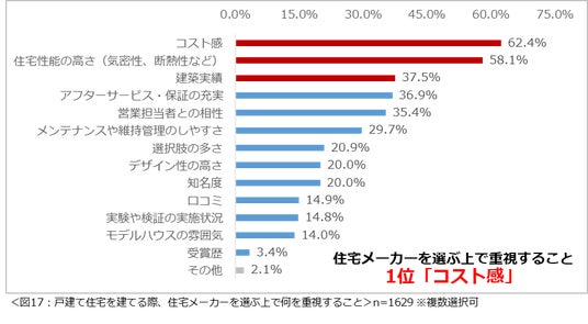 もし戸建て住宅を建てるなら、住宅メーカーを選ぶ上で何を重視するか尋ねたところ、「コスト感」(62.4%)という回答が最も多く、次いで2位が「住宅性能の高さ」(58.1%)、3位「建築実績」(37.5%)という結果になりました。(図17)