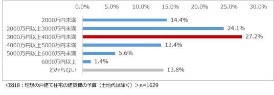 理想の戸建て住宅の建築費の予算について尋ねたところ、「3000万円以上4000万円未満」(27.2%)という回答が最多となりました。(図18)