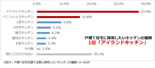 もし戸建て住宅を建てるなら、採用したいキッチンの種類について尋ねたところ、周囲に壁がない、文字通り島のように設置されている「アイランドキッチン」(37.4%)が1位、次いでキッチンの左右どちらかが壁に接している「ペニンシュラキッチン」(15.8%)を希望していることが分かりました。(図14)