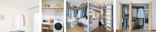 ウォークインクローゼットは、天棚とハンガーパイプで構成したシンプルなタイプと、さらに収納棚と引き出しを充実させたタイプをご用意しております。人気のシステムクローゼットでは、奥行きを有効活用する「スライドハンガー」や、上下2段式で収納できる「ダブルハンガー」、「小物入れ」「衣装ケース」などが備わっており、ハンガーにたっぷり衣服をかけられるので、たたむ手間も少なく、衣替えの手間も軽減。廊下や洗面脱衣室に併設し、ご家族共用の収納として使用する方も多くいらっしゃいます。