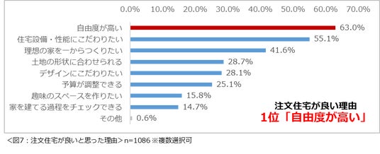戸建て住宅を購入する際に「注文住宅」を希望すると回答した1086名にその理由について尋ねたところ、「自由度が高い」という回答が最も多く63.0%という結果になりました。(図7)