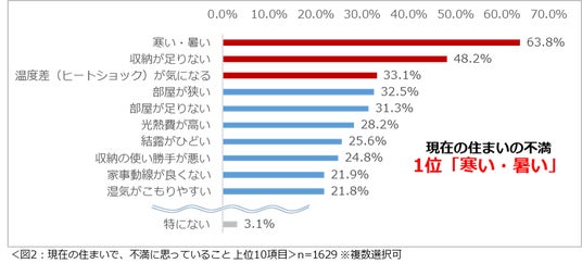 現在の住まいで、不満に思っていることを尋ねたところ、「寒い・暑い」(63.8%)という回答が最も多く、次いで2位が「収納が足りない」(48.2%)、3位「温度差(ヒートショック)が気になる」(33.1%)という結果になりました。(図2)