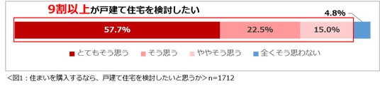 現在、賃貸または実家に住んでいると回答した1712名に、「もし住まいを購入するなら、戸建て住宅を検討したいと思いますか?」と尋ねたところ、「とてもそう思う」57.7%、「そう思う」22.5%、「ややそう思う」15.0%を合わせると、9割以上の人が戸建て住宅を検討したいと思っていることが分かりました。(図1)